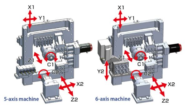 ●The back tool post with Y axis enables the simultaneous operation of back side complex machining with main side machining. (6-axis machine)