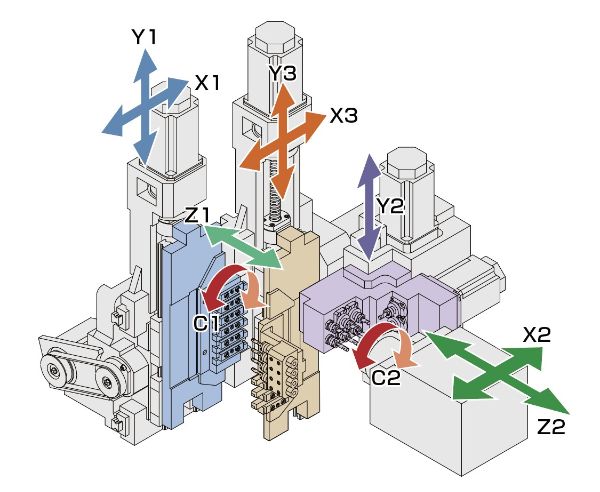 ●The combination of independent opposed tool posts and the back tool post with Y axis enables the diverse simultaneous processing.