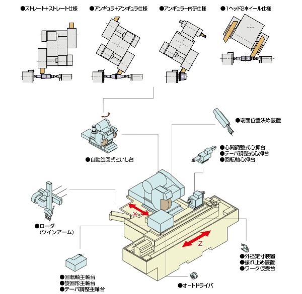 ●ワンチャックでストレート、アンギュラテーパ研削が自由自在に選択可能